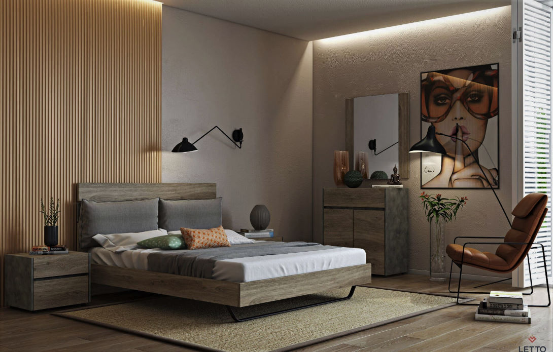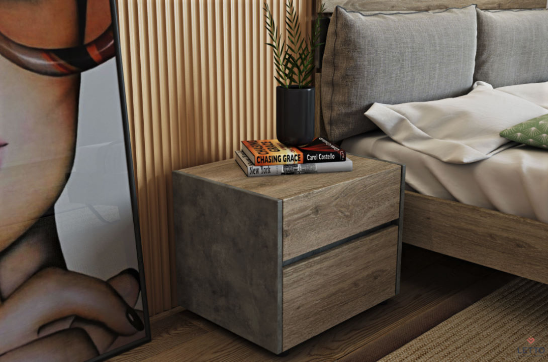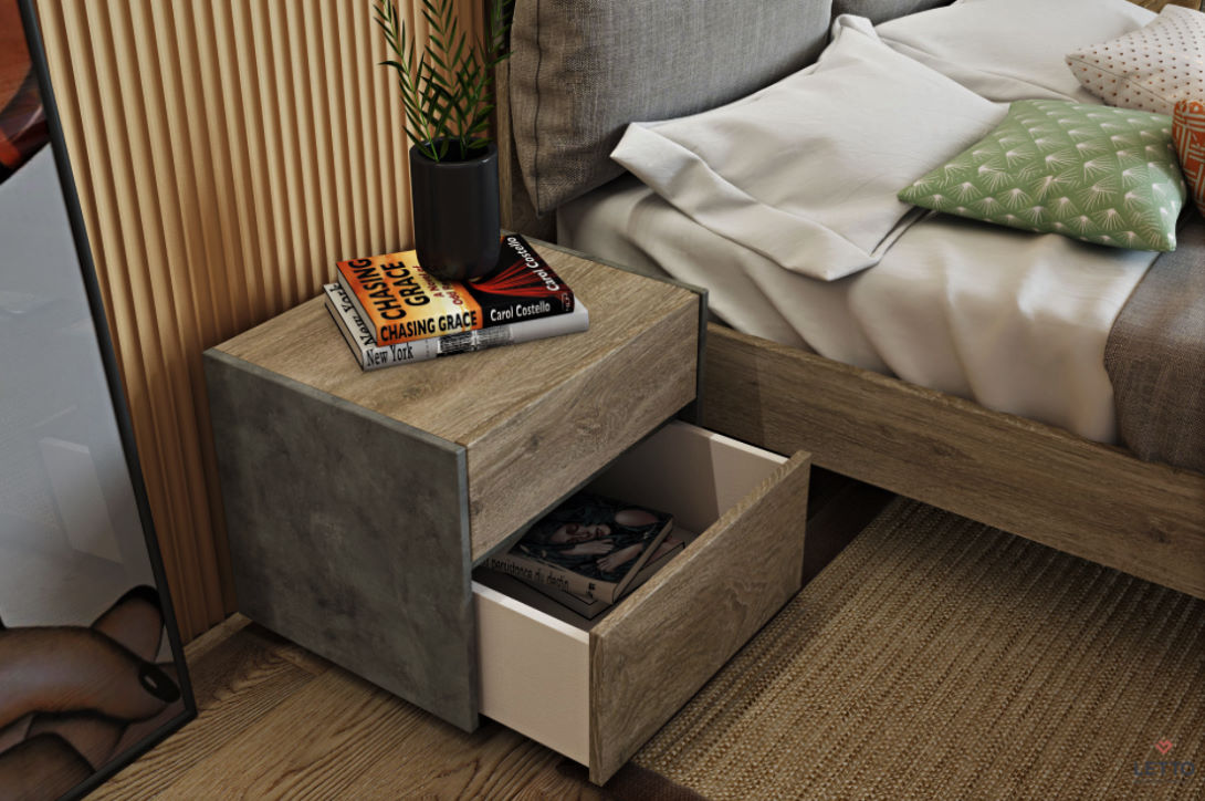 Το κρεβάτι Joy είναι κατασκευασμένο από τεχνητό καπλαμά σε χρώμα (m21) cashmere grey rustic oak και συνδυάζεται άριστα με τις διακοσμητικές επιφάνειες σε στυλ τσιμέντου.Με αλέκιαστο πλενόμενο ύφασμα στα μαξιλάρια του κεφαλαριού και επιφάνειες που διαθέτουν anti-scratch coating για μεγαλύτερη αντοχή κατά των χτυπημάτων,