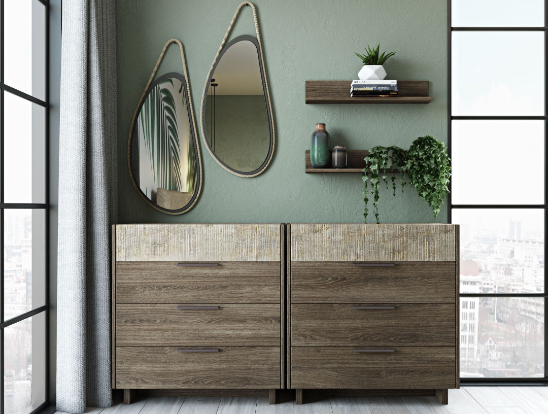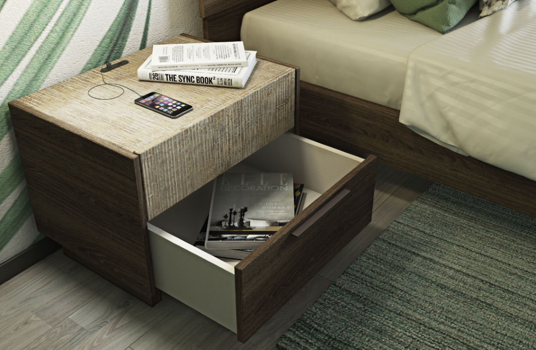 Τα κομοδίνα φέρουν ανάγλυφες επιφάνειες σε αίσθηση πατίνας, χρώματος linen beige και είναι διαθέσιμα σε δύο διαστάσεις, 60cm και 50cm και δυο χρωματικές επιλογές light brown rustic oak (m.22) και lava grey oak (m.23), αντίστοιχα.