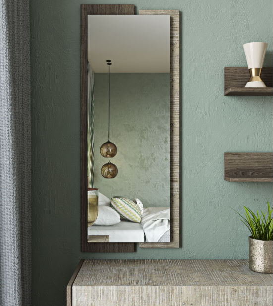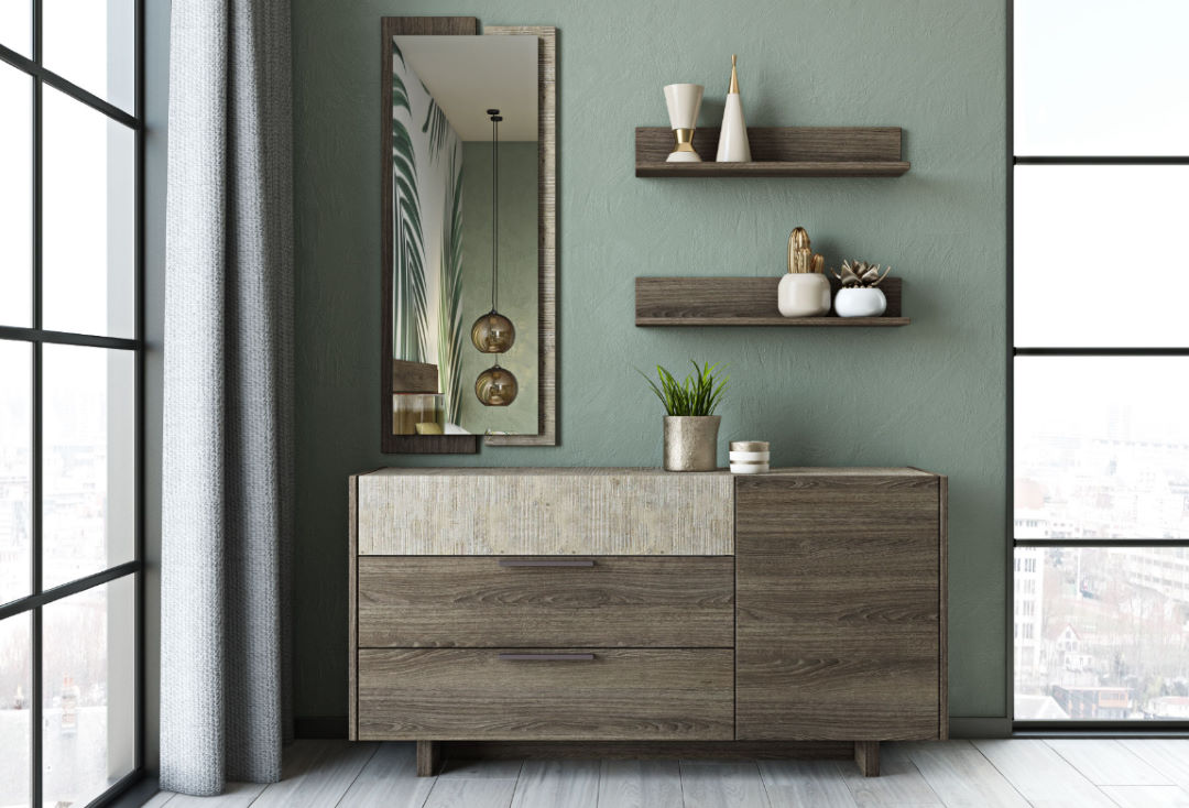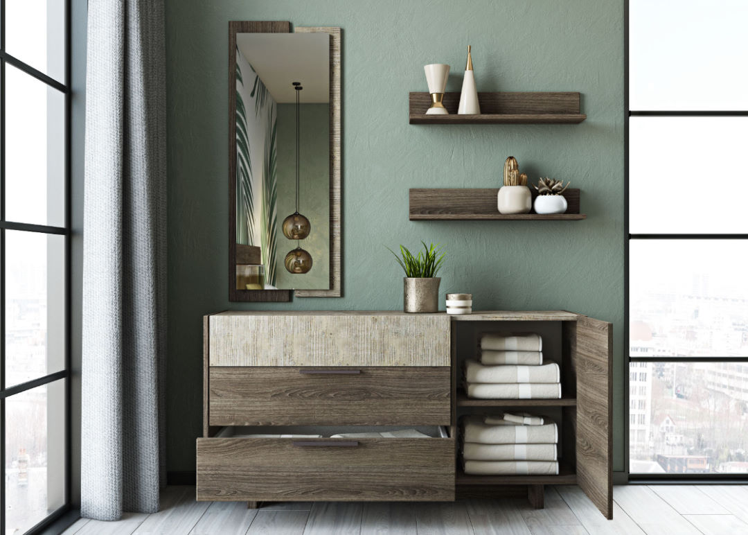 - σύνθεση επίπλου χαμηλής συρταριέρας με δύο ράφια και ολόσωμο (sic) καθρέπτη