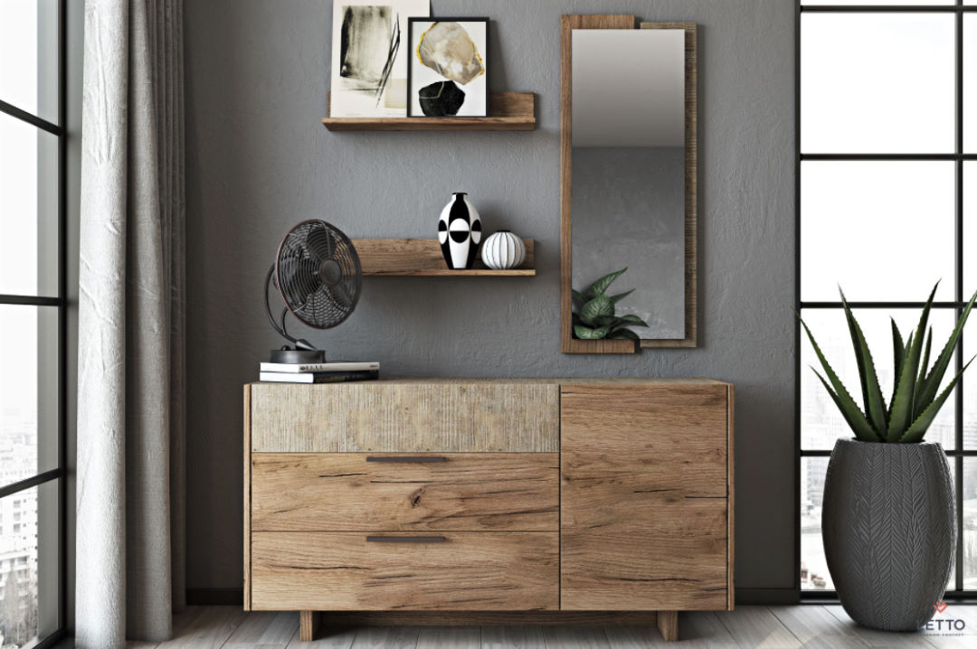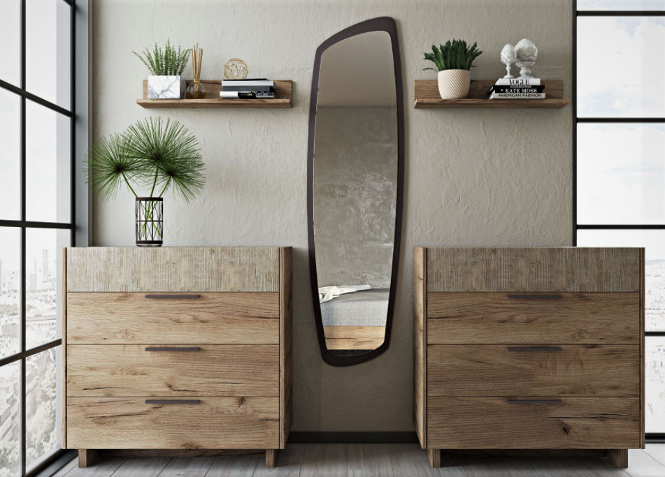 - Σύνθεση επίπλου χαμηλής συρταριέρας με δύο ράφια και ολόσωμο (sic) καθρέπτη