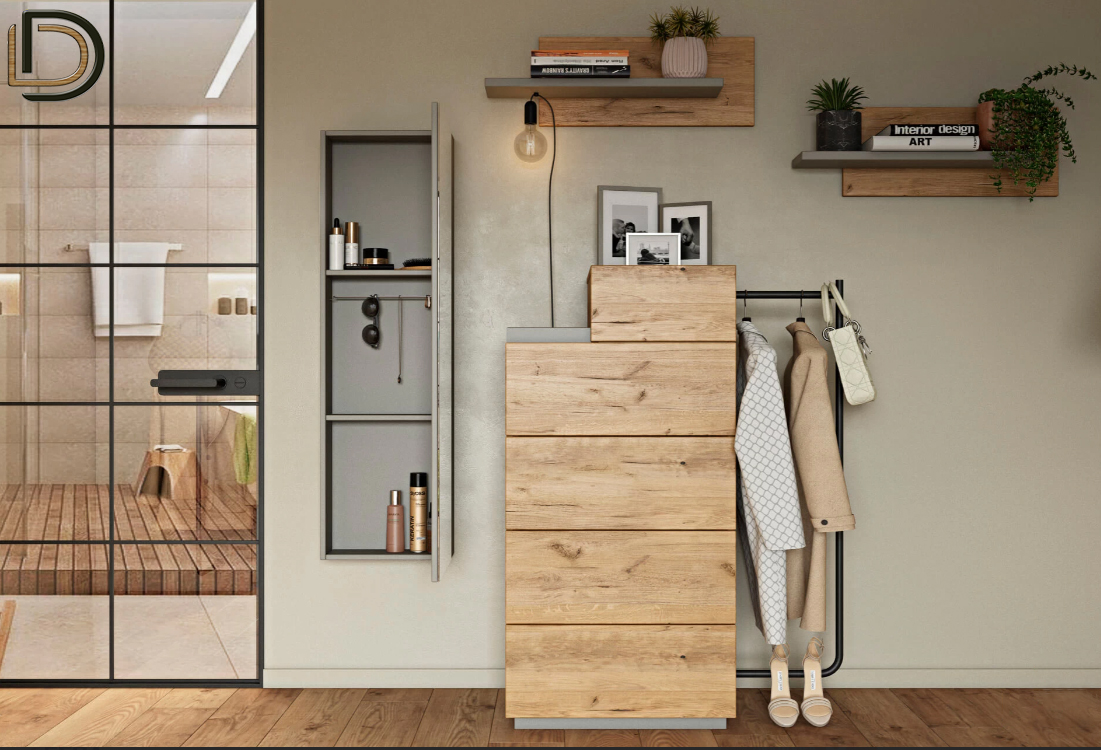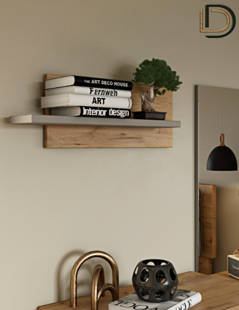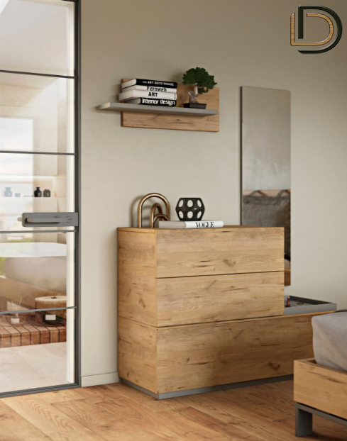 - σύνθεση επίπλου χαμηλής συρταριέρας με ενα ράφι και ολόσωμο καθρέφτη.